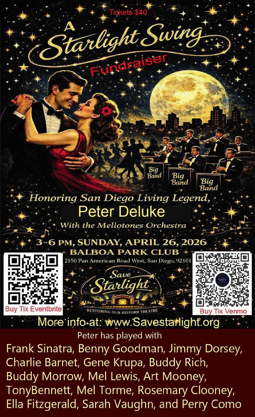 On April 26th, we gather not only to raise funds for the restoration of the historic Starlight Bowl — we gather to honor a man whose life represents the very spirit of Starlight itself. This will be an evening of Big Band Music, Dancing, and comradery.