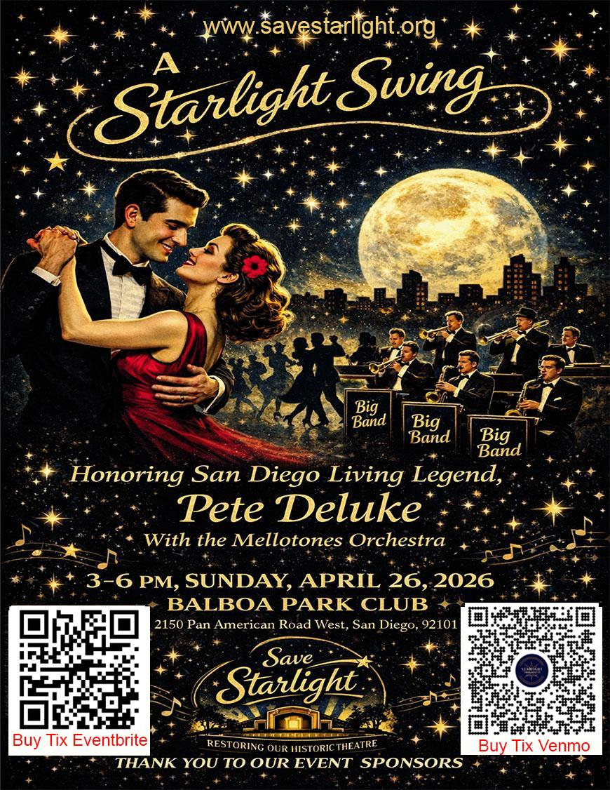 We have many exciting things planned for this late afternoon event full of “Big Band” music and a special dedication to San Diego Living Legend Peter Deluke. We are still working on the details, and hope that you will come back here to see an update. We anticipate this to be a “Celebration” of people and Balboa Park and to recognize some amazing people that have helped shape the history of Starlight Bowl.